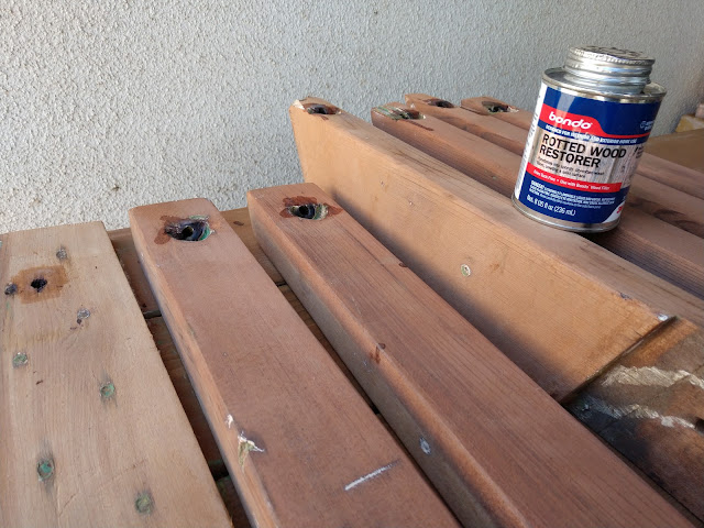 It's pretty cool that you can find advice and product recommendations for just about anything, especially as someone new to outdoor furniture restoration. After searching for what would work best with old wood, I found Bondo's Rotted Wood Restorer and Bondo's Wood Patch, and went to work.
